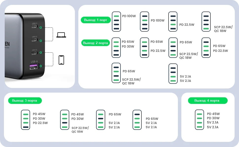 | USB-C1 / C2 (макс. 100 Вт): | 5В/3А, 9В/3А, 12В/3А, 15В/3А, 20В/3.25А, 3.3-21В/3А |