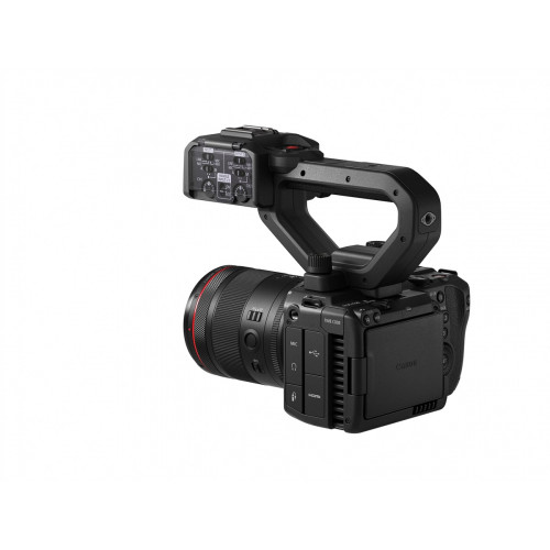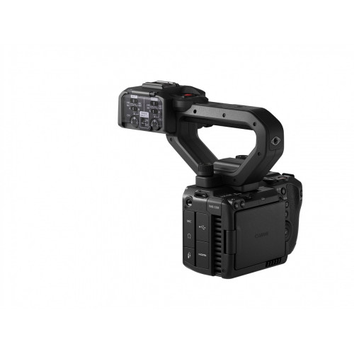 Входящая в комплект съемная рукоятка обеспечивает дополнительную connectivity для handheld-конфигурации C50. Два полноразмерных 3-контактных XLR-входа с фантомным питанием 48V позволяют подключить shotgun-микрофоны. Встроенная кнопка начала/остановки записи и зум-рокер предлагают легкодоступные элементы управления при съемке нижних ракурсов.