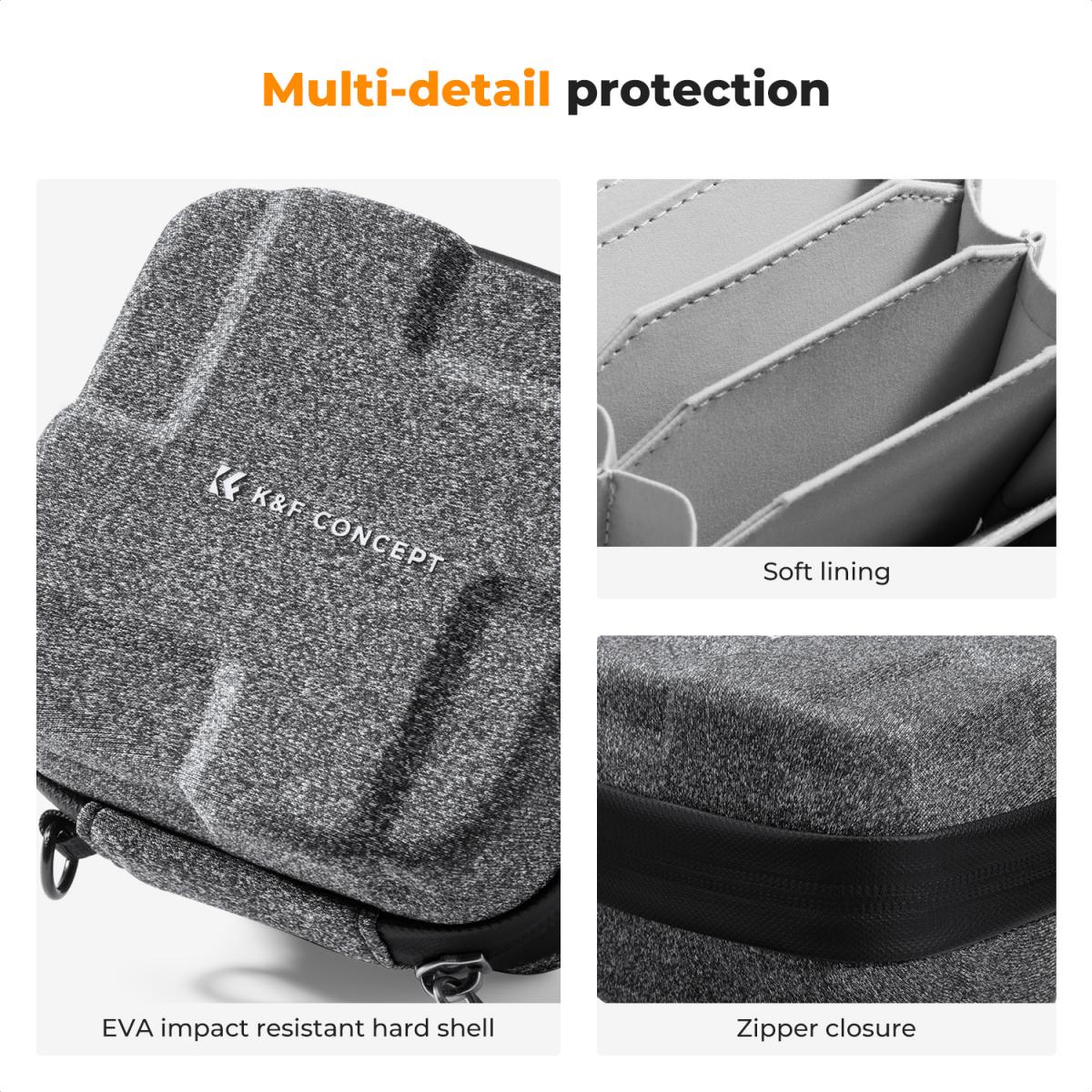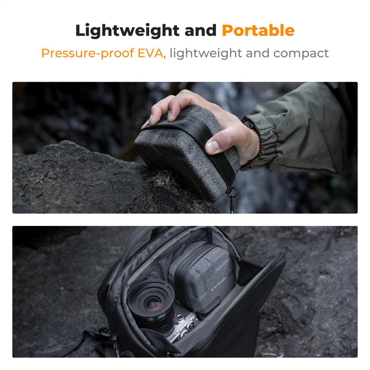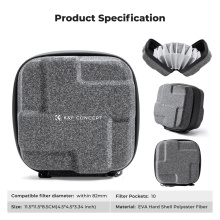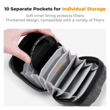 Чехол-коробка для хранения фильтров от K&F Concept, модель KF13.185, рассчитан на размещение до 10 круглых фильтров диаметром до 82 мм. Корпус выполнен из твёрдого материала EVA hard-shell, обеспечивающего защиту от ударов и давления, внутренняя подкладка мягкая и нежная, чтобы исключить царапины стекол. Замок-молния проходит по периметру для удобного доступа, а съёмный ремешок позволяет носить чехол как отдельный аксессуар или закреплять его внутри сумки-фоторюкзака. Чехол идеально подходит для организации фильтров на выезде, в студии или в путешествии — компактный, прочный и легко помещается в комплект с фотооборудованием.