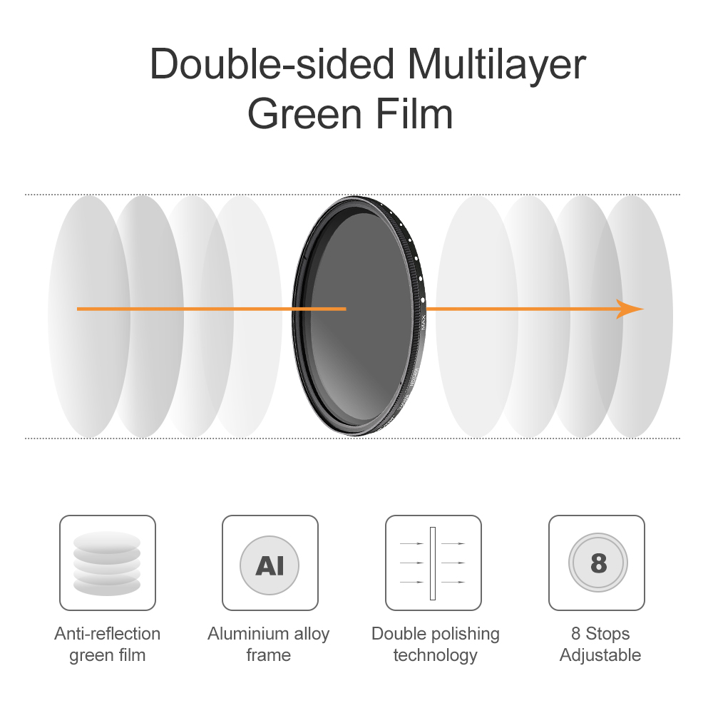 Регулируемый фильтр нейтральной плотности (VND) или, как его называют, Fader ND, представляет собой настраиваемый фильтр, что позволяет плавно изменять плотность затемнения от 1 до 8 и более ступеней. Он работает также, как поляризационный фильтр, где передний элемент врашается, регулируя количество света, поступающего в объектив. Термин "нейтральный" используется потому, что фильтр не вносит искажения в цвет, изменяя только количество света, поступающего в объектив