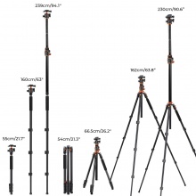 Оснащен шаровой головкой, боковой поперечной центральной колонной и возможностью преобразования одной ножки штатива в монопод.